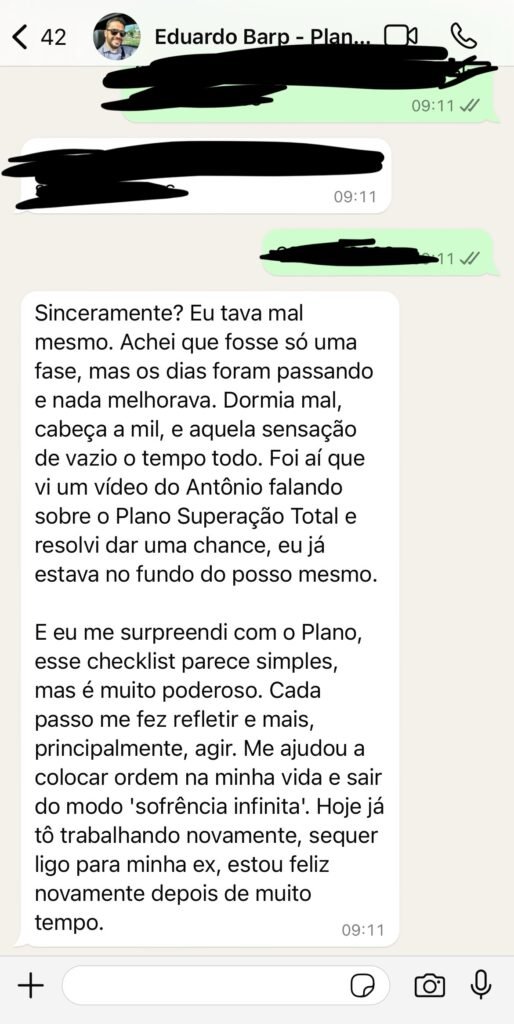 Você já sabe o que precisa fazer para superar essa dor. Agora, só falta tomar a decisão certa. O Plano Superação Total é o caminho mais rápido e direto para romper de vez com o sofrimento, recuperar sua paz interior e volta a viver com leveza.