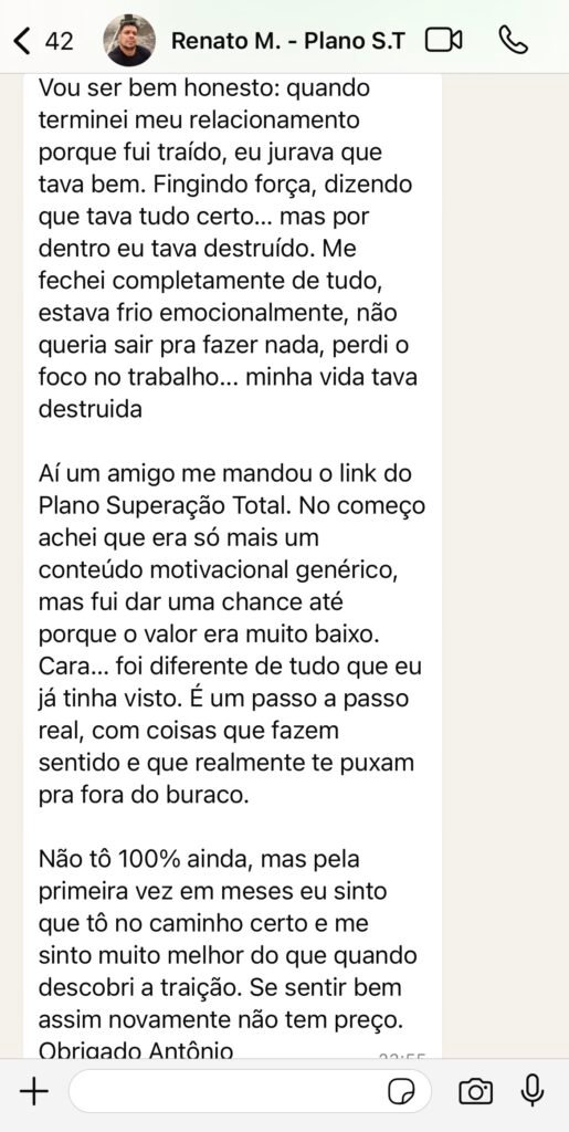 Meu nome é Antônio e, assim como você, já passei pela dor devastadora da traição. Sei como é acordar todos os dias com um peso no peito, revivendo cada detalhe e buscando uma saída. Tentei terapia, artigos, cursos… mas nada realmente mudava o que eu sentia. O tempo passava e eu continuava preso àquele sofrimento.
