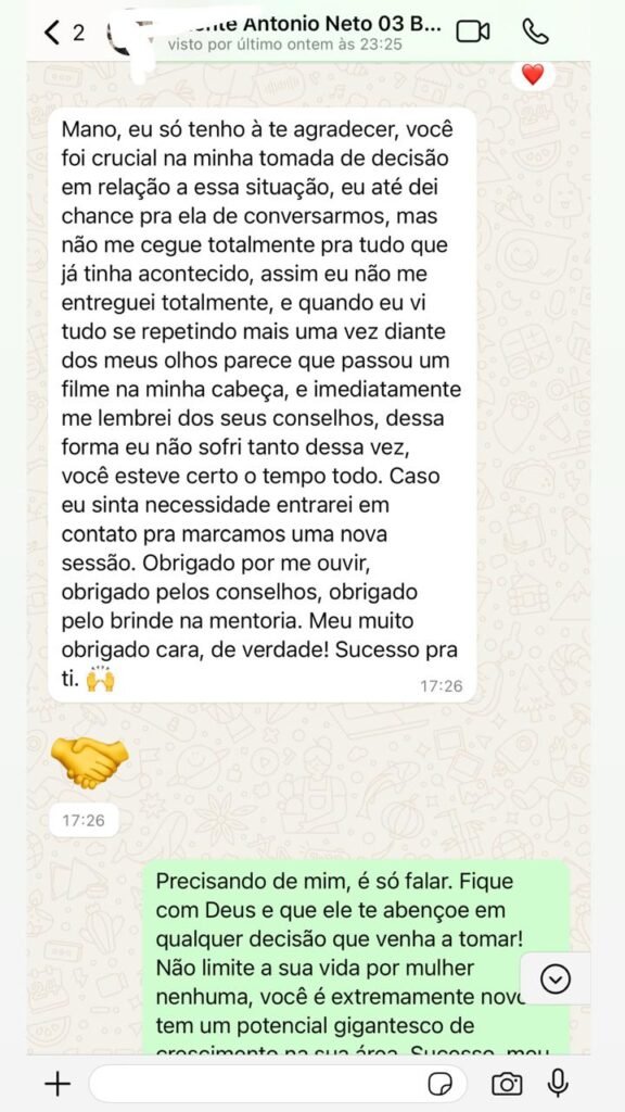 Um processo direto, 1:1, onde ele te escuta de verdade e te mostra como reconstruir quem você é — sem enrolação, sem terapia de anos, e sem fórmulas mágicas.